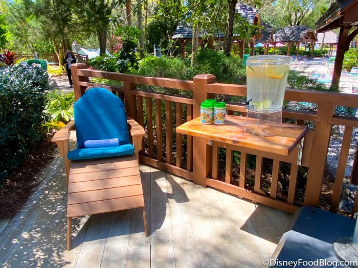 So at this point, you might be wondering what perk is worth $225. Well, we’re going to tell you. So this is a perk you can get at Disney World’s water parks. We recently visited Blizzard Beach and invested $225 in what’s called “Polar Patios,” which is a private, shaded deck that you can get at the water park. Basically, think of it as a cabana. As you can see, it’s a pretty nice space.