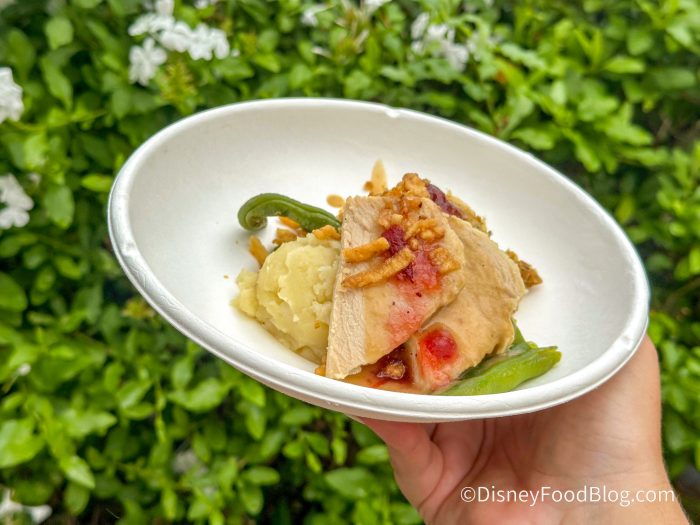 American Holiday Table serves up traditional Thanksgiving flavors from its spot in The American Adventure Pavilion… and more! Returning favorites here include the Slow-roasted Turkey and Blackened Catfish, and this is also where you can find the SNICKERS-Doodle Cookie.