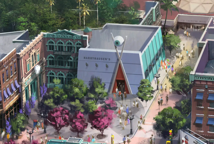 If we move towards the top of the concept art, close to the new attraction, we can see in the place where Mama Melrose’s currently sits, appears to be Harryhausen’s Restaurant – the very same restaurant Mike Wazowski takes Celia Mae out on a date for her birthday.