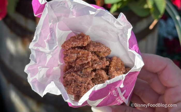 Now, it may already be your happy habit to pick up some Cinnamon-glazed Almonds or Cinnamon-glazed Pecans, as they’re a fairly common find in the Disney World parks. But the Cinnamon-glazed Cashews are unique to the Festival of the Holidays.