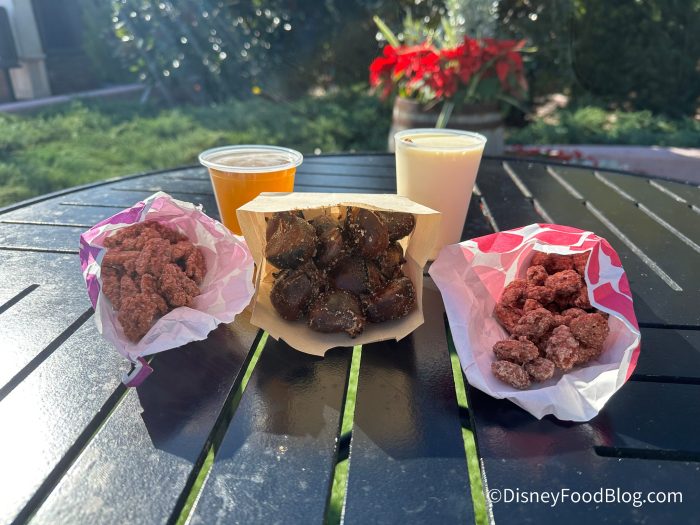 We definitely recommend snacking on the cinnamon-glazed nuts here! If you’re looking for some nostalgic holiday items, the chestnuts and eggnog might be fun for you. If you’re adventurous, give the beer a try, but know it has a bit of an interesting flavor profile. This might not be a must-stop booth, but you’ll find some cheerful treats here!