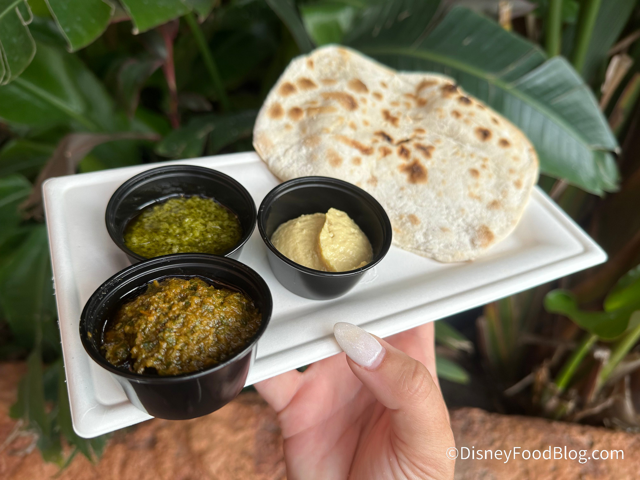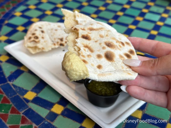 The accompanying dips are hummus, chermoula, and a Zhoug dip, and while the chermoula and Zhoug sauces themselves certainly add a bit of a herby kick to the bread, you’ve got the regular hummus there, too, if you’re not as adventurous. We certainly think it’s a solid option and can be friendly to pickier and more adventurous eaters.