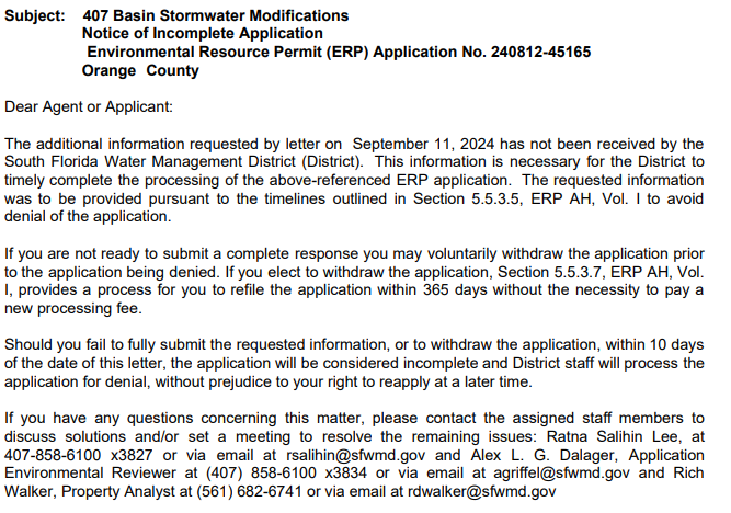 In September, the South Florida Water Management District requested additional information for the permit. An additional letter was sent on December 3rd, giving Disney 10 days to get that information and correct the permit to the district or the permit will be denied.