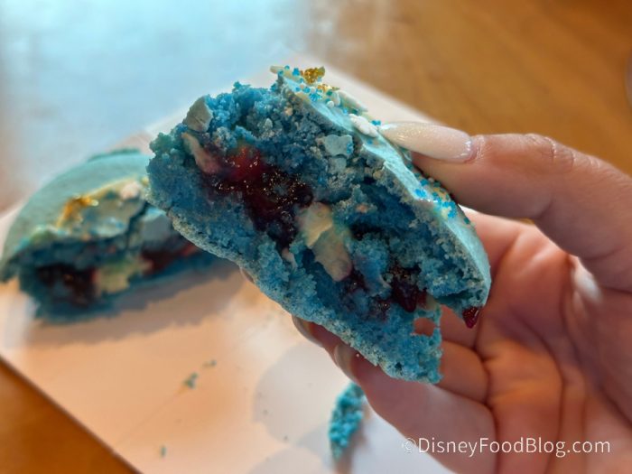 This dessert reminded us of an almond cheesecake. The macaron itself was pretty standard and was dyed blue. However, the cranberry cherry jam is the star here. We got cream cheese and black cherry flavors, making the jam a very pleasant surprise. The gold flakes and little sprinkles at the top were also super cute.