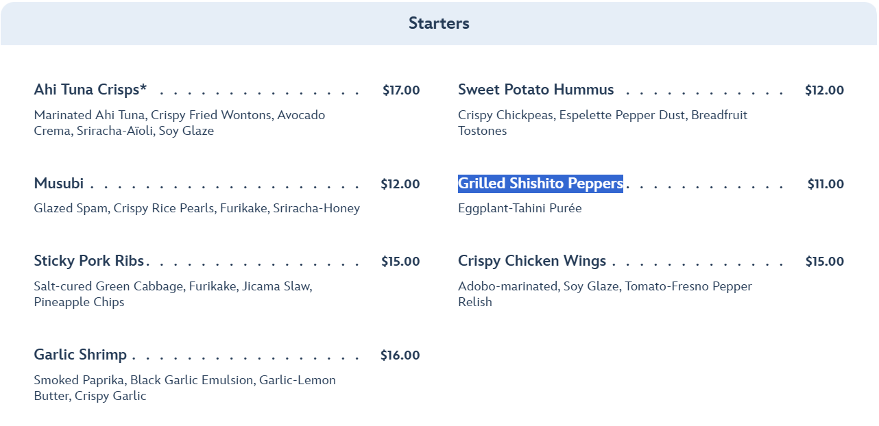 Want a look at the full menu? It’s available now! Starters also include Garlic Shrimp and Grilled Shisito Peppers.