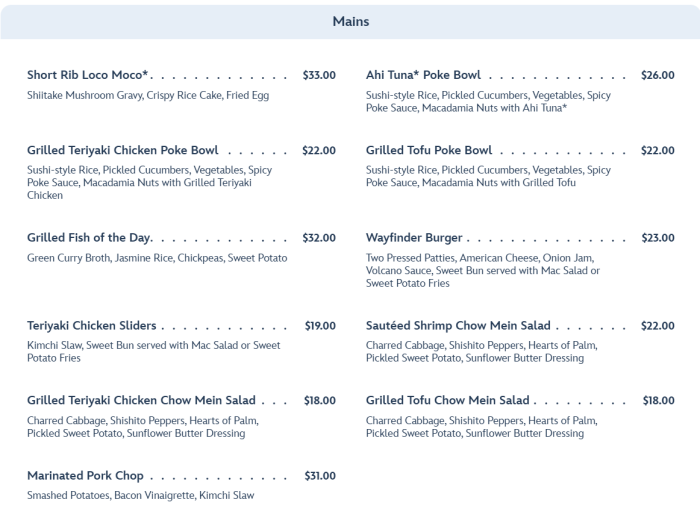 Well, now Disney has revealed the lunch and dinner menu for this restaurant. Here’s a list of just some of what you’ll find at the new restaurant.