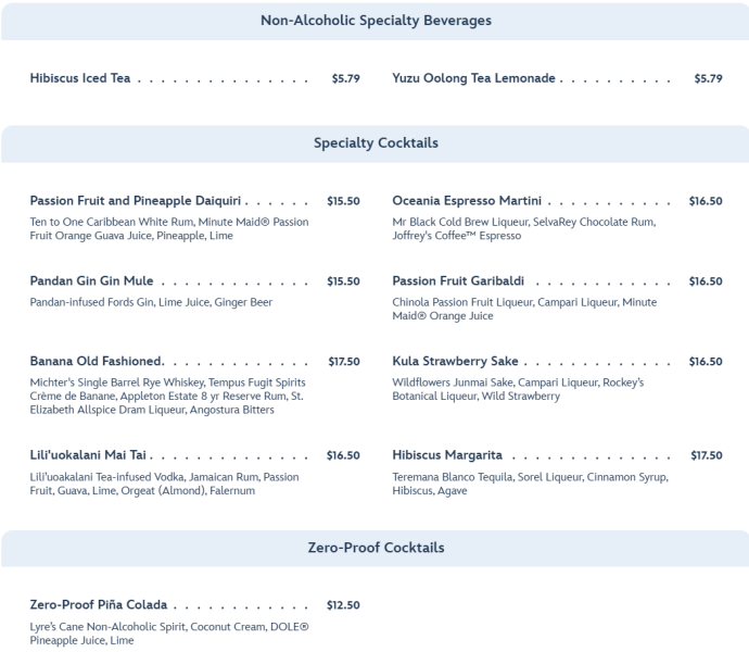 That’s especially true when we learn about new dining spots coming to Disney World. We’re eagerly awaiting more news on the Spaceship Earth Lounge coming to EPCOT and the Pirates of the Caribbean Tavern coming to Magic Kingdom. Well, we’ve been waiting to get some FOOD details at the new restaurant coming to Island Tower at Disney’s Polynesian Village Resort — and NOW THE FULL MENU HAS ARRIVED.