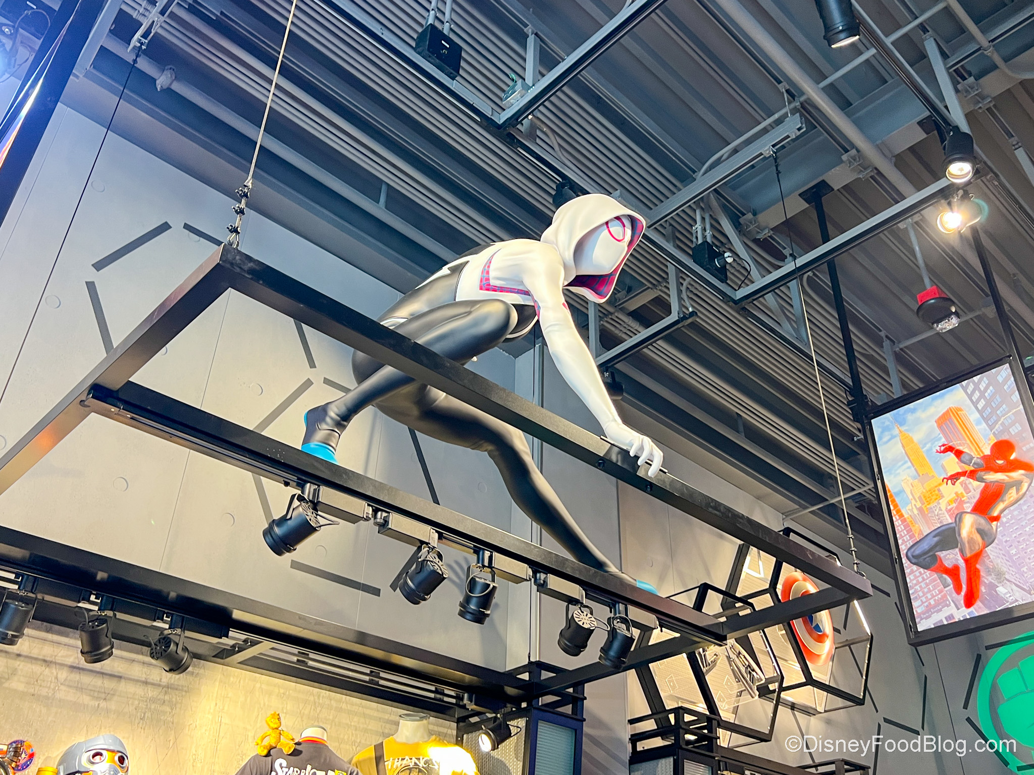 The store also features some cool details, like this Ghost Spider crawling across the ceiling.