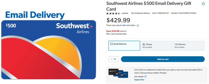 Get Southwest $500 Email Gift Card from Sam’s Club