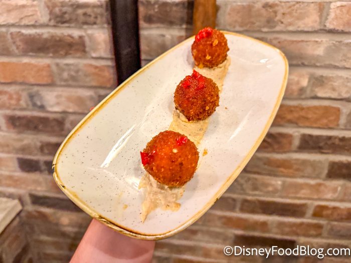 For our next appetizer, we’re actually heading over to one of Disney World’s moderate resorts — Port Orleans Riverside! This hotel is home to Boatwright’s Dining Hall, which is a real hidden gem with a few knockouts on the menu. One of our favorite items is the Pimento Cheese Fritters on the appetizer list.