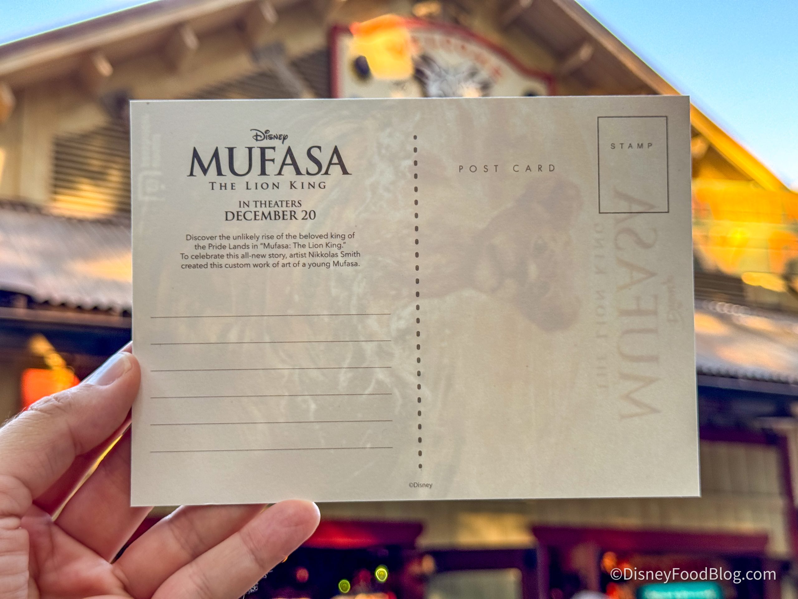The front of the card features Mufasa, and the back has space for you to write a note. You can even send this postcard to someone if you put in an address and attach a stamp! Or you can keep it for yourself to celebrate the new movie. The postcard is available for pick up from December 8th through December 18th, 2024.