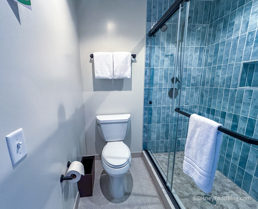 The bathroom is fairly small, with a door to close off the toilet and shower. We love that blue water-like tile, though!