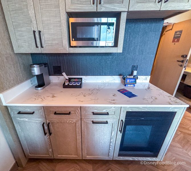 Since these are DVC rooms, you get a kitchenette, complete with mini fridge and microwave. There’s a decent amount of cabinet storage.