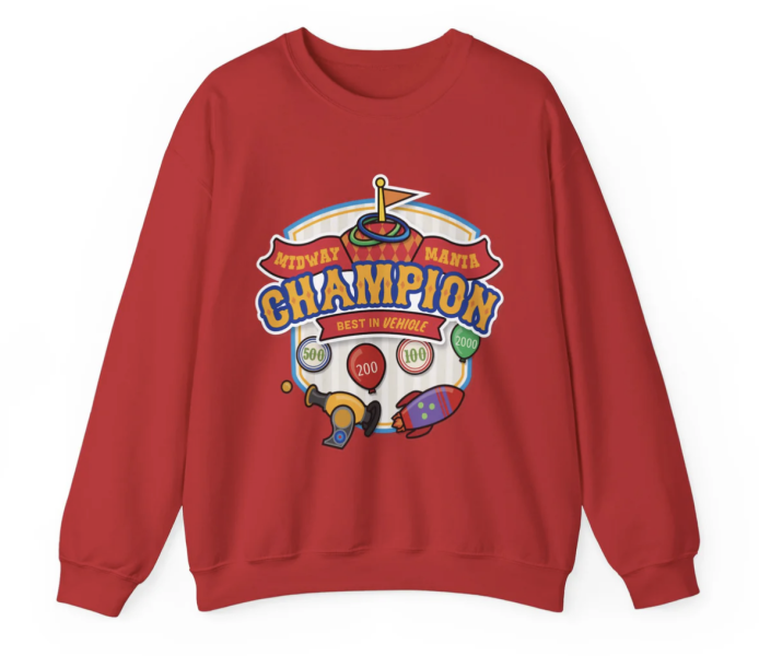 Being a Toy Story Mania champion is something to be PROUD of, so show off your elite status with the Midway Mania Champion Sweatshirt! It also works to intimidate the people you’re with and scare them so they do worse than you do.