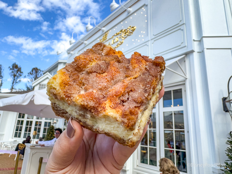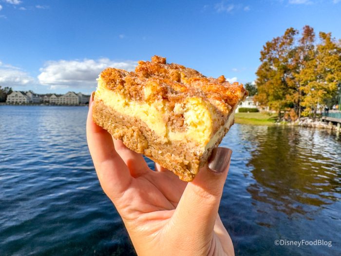 We stopped by The Cake Bake Shop by Gwendolyn Rogers at Disney’s BoardWalk to try a new treat! The Snickerdoodle Cheesecake Bar is made with snickerdoodle cookie crust topped with our signature cream cheese filling, sprinkled with cinnamon sugar, and crumbled snickerdoodle cookie dough — and it’s a whopping $13.99.