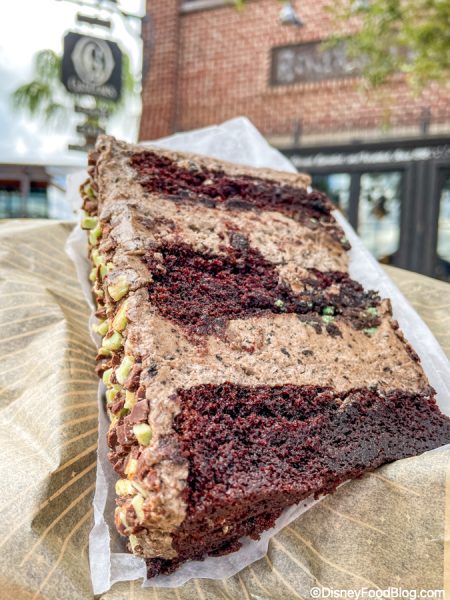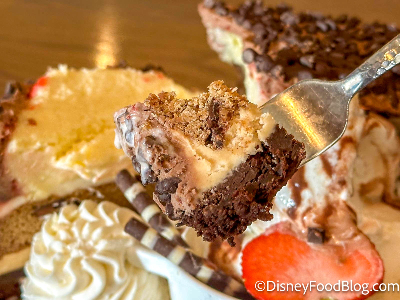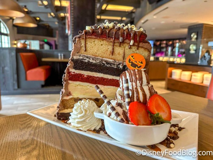 Okay, so technically this one isn’t a Disney World cake. It’s served at The Kitchen Restaurant in Universal Orlando’s Hard Rock Hotel. But we had to include it because, wow, what a dessert! The Kitchen Sink is seven layers of indulgence, featuring brownie, peanut butter crème, chocolate chunk cookie, red velvet, vanilla cheesecake, devil’s food chocolate cake, and vanilla chiffon, all topped with ice cream, chocolate sauce, and strawberries.