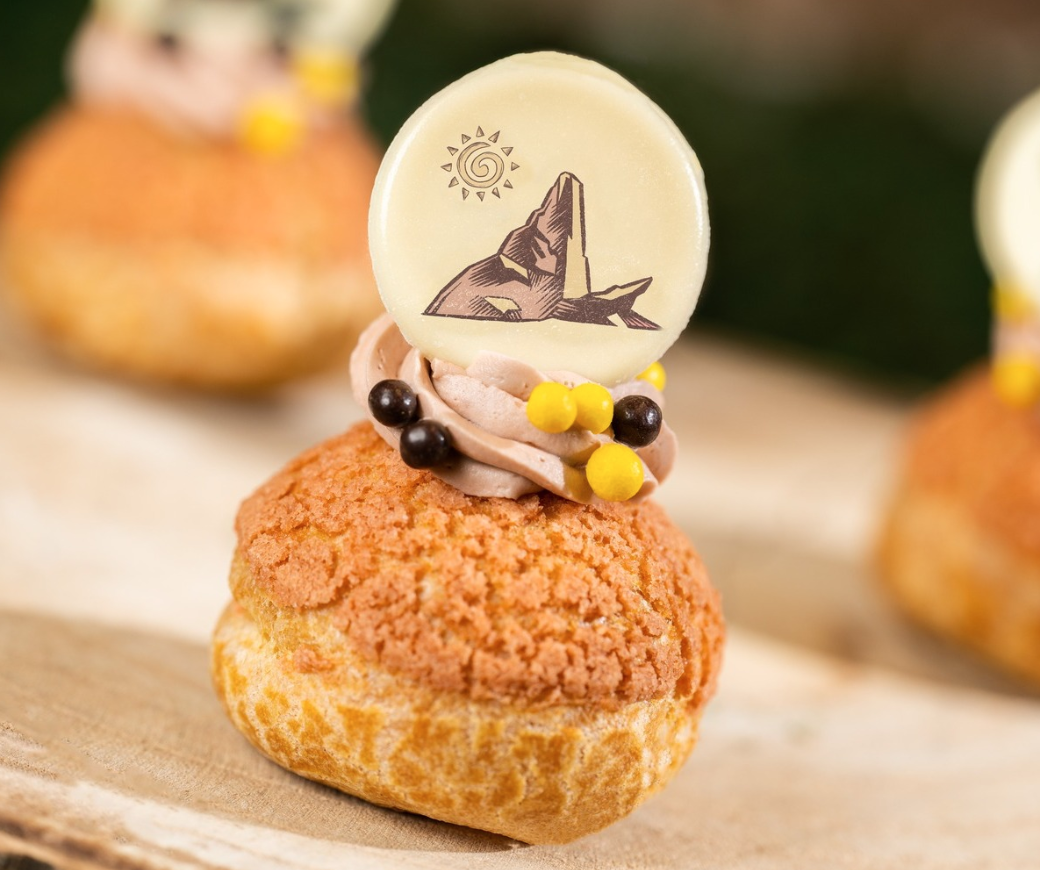 The Mufasa Pride Rock Profiterole can be found at Creature Comforts in Animal Kingdom (the park’s Starbucks location). It’s a cream puff filled with chocolate cream and whipped coffee ganache.
