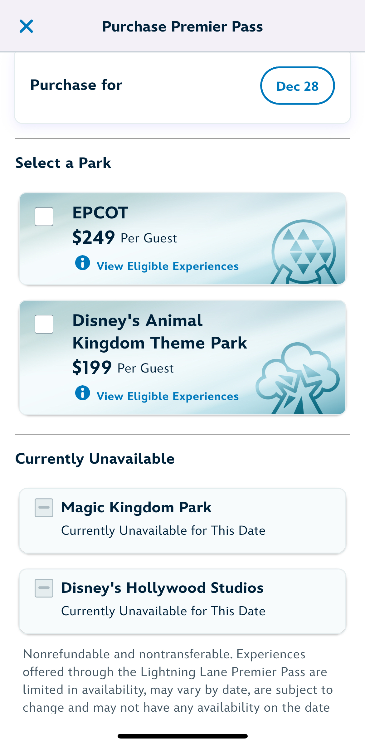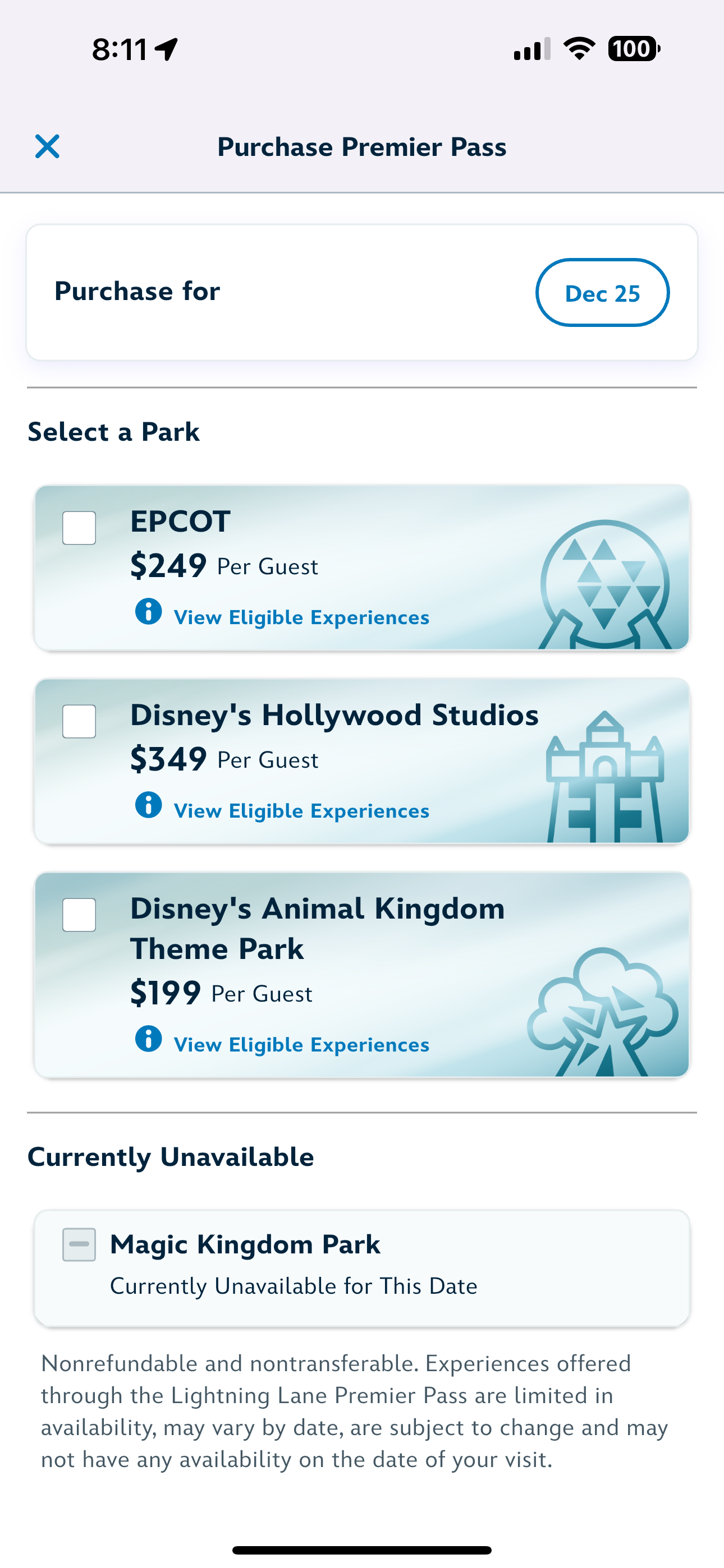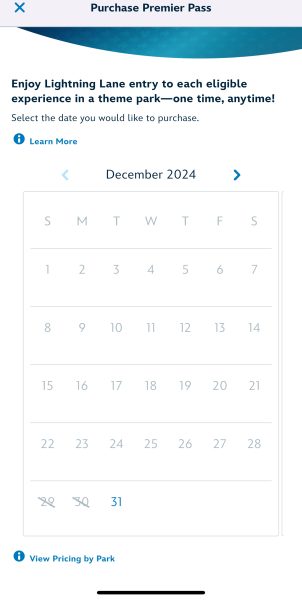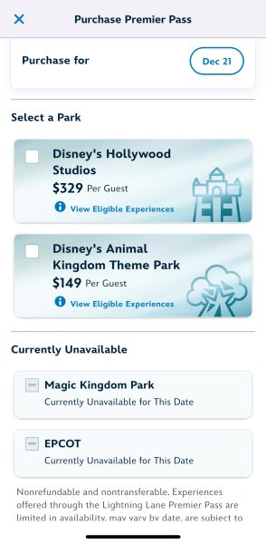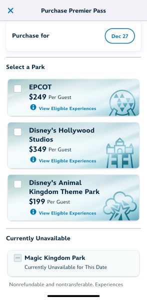 Magic Kingdom was also out for December 25th, Christmas Day. That day, the price for the Premier Pass was $449.