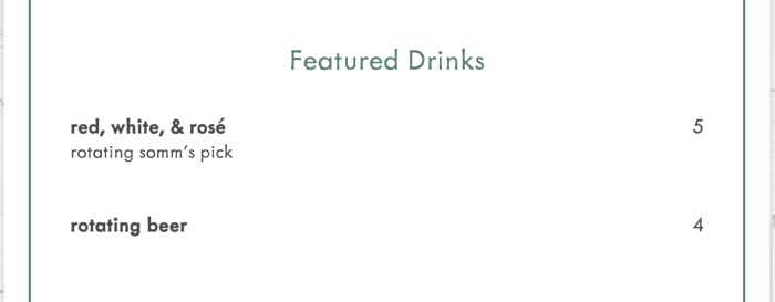 Personally, we’ll be grabbing the espresso martini for a little pick-me-up, but if you’re more of a wine or beer drinker, they also have that! You can grab a glass of red, white, or rosé for $5, which is over half-off compared to their lunch and dinner pricing per glass. Rotating beers are $4 each.