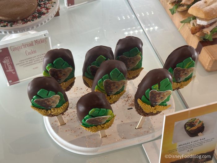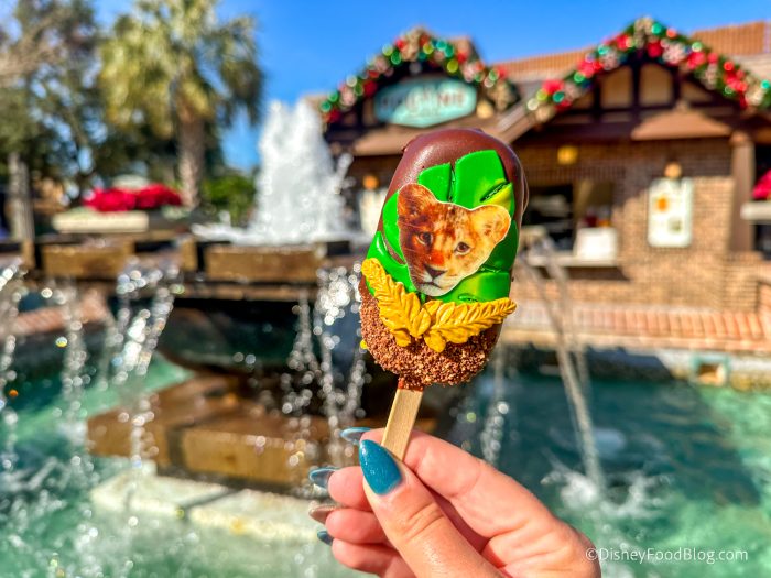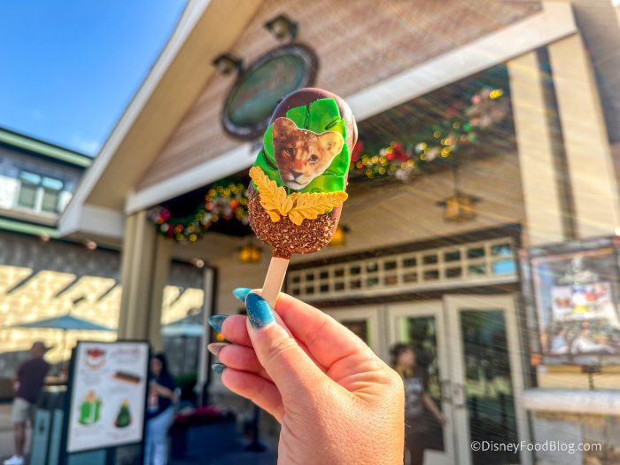 Amorette’s Patisserie is located in the Town Center area of Disney Springs. It is a French-style bakery that serves up a variety of pastries, cakes, and other treats. We are here to grab the Mufasa Cake Bar! This bar contains a cinnamon-vanilla mouse and vanilla chiffon with caramel chocolate-coated feuilletine crunch dipped in dark chocolate. You can get it for $8.25.