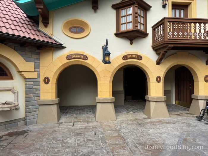 Back on the outside, the restrooms are sporting new wood-style signs with the German labels “Herren” for men and “Damen” for women. These were previously labeled “Prince” and “Princess”.