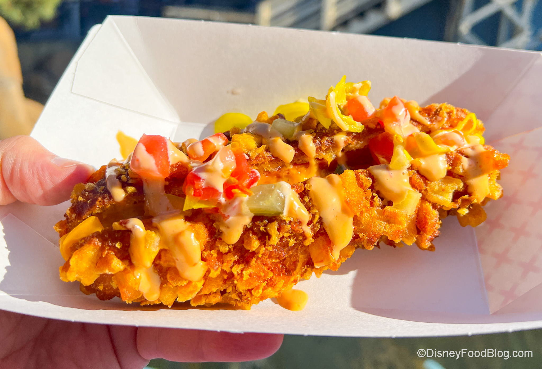 - SoCal Corn Dog rolled in fries and topped with tomato and pickle relish, American cheese, and house dressing (New) — $10.79
