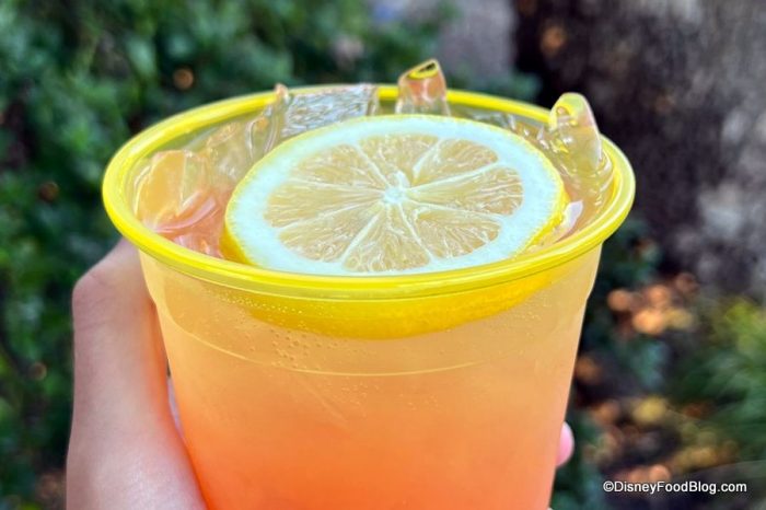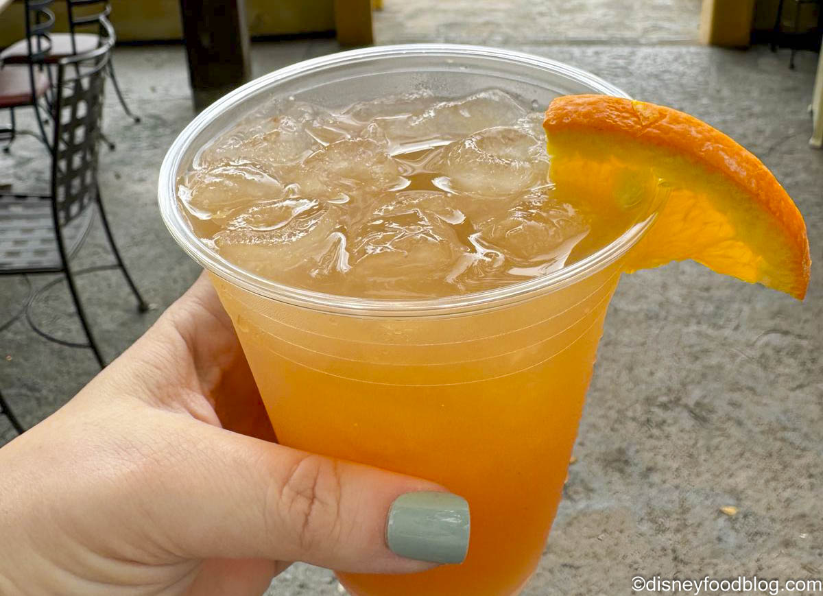 Huckleberry-Citrus Cooler: Gold Peak Black Tea, huckleberry and agave syrups, grapefruit soda, and lemon and orange juices garnished with an orange wedge (Non-alcoholic beverage)