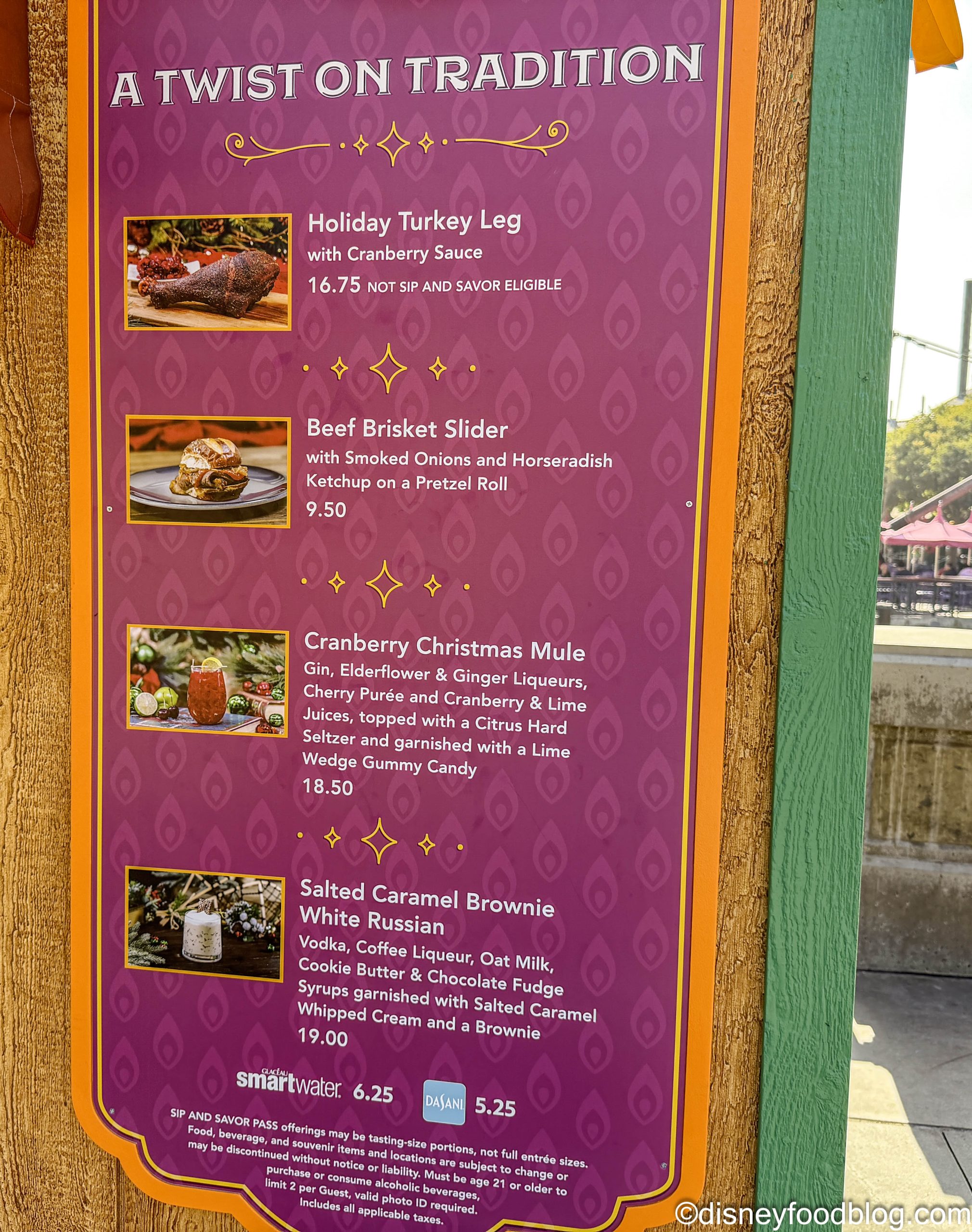 - Cranberry Christmas Mule: Gin, elderflower and ginger liqueurs, cherry purée, and cranberry and lime juices topped with a citrus hard seltzer and garnished with a lime wedge gummy candy — $18.50
