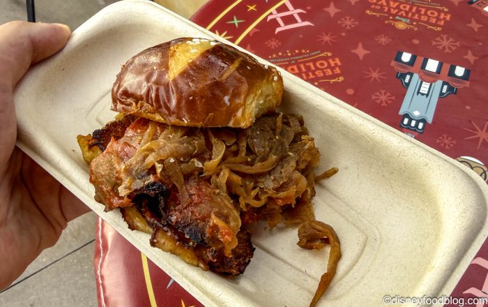 - Beef Brisket Slider with smoked onions and horseradish ketchup on a pretzel roll — $9.50