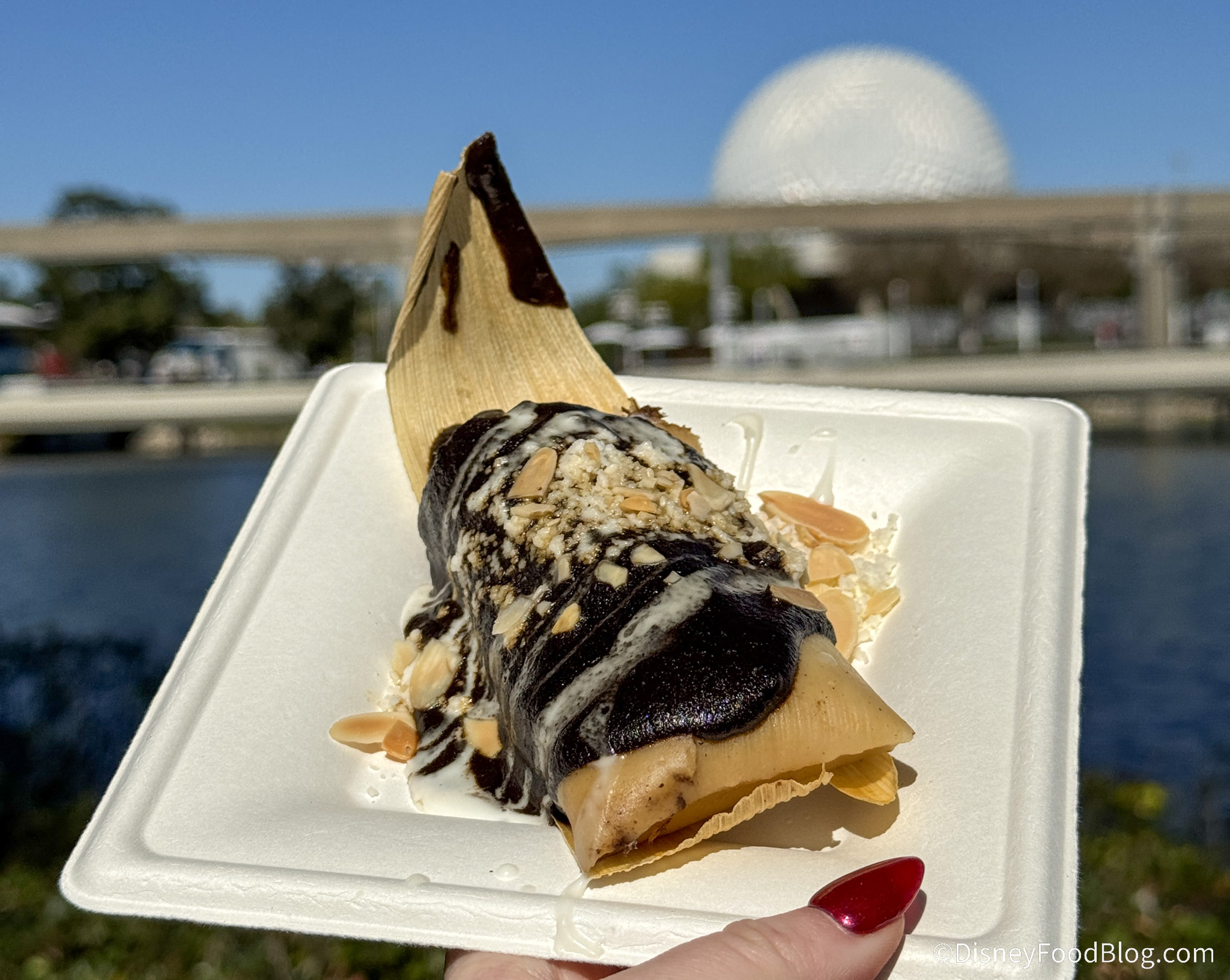 - Tamal de Pollo con Mole: Shredded chicken and mole in corn masa topped with mole negro, queso fresco, crema Mexicana, slivered almonds, and sesame seeds (New) — $9.00; Disney Dining Plan snack credit