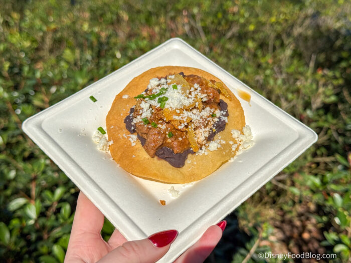 - Tostada de Carne: Braised beef tips slowly cooked Mexican-style atop a fried corn tortilla with black beans, crispy onions, and queso fresco (New) — $8.00; Disney Dining Plan snack credit
