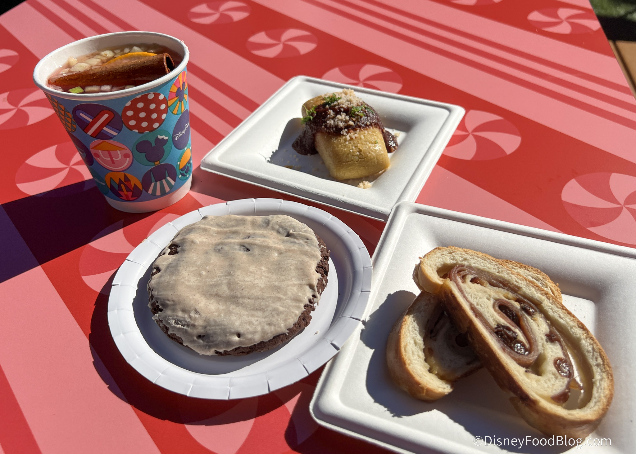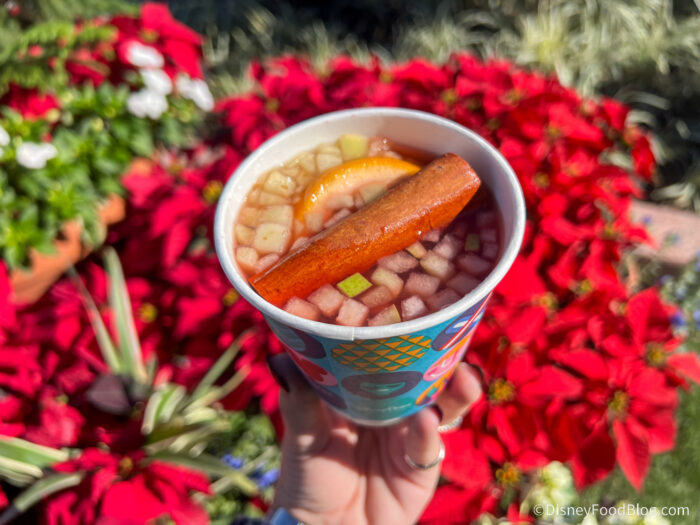 - Ponche Navideño: Christmas punch with apples, pears, guava, oranges, dried hibiscus, brown sugar, tamarind, cinnamon sticks, and cloves (Served warm) (Non-alcoholic) – $4.00, Disney Dining Plan snack credit eligible