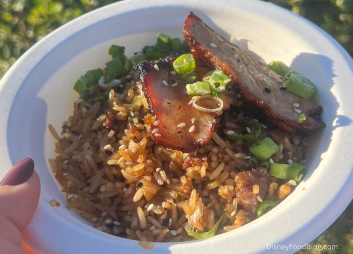 - BBQ Char Siu Pork Fried Rice with Chinese La Chang sausage, egg, yellow onion, green onion, and sesame (New) — $9.50, Disney Dining Plan snack credit