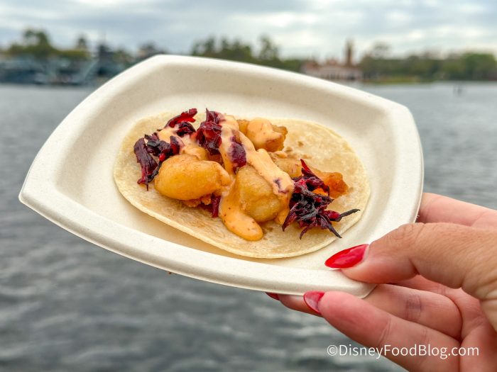 Taco de Camarón: Crispy tempura-battered shrimp in a flour tortilla with dried hibiscus flowers and chipotle aïoli