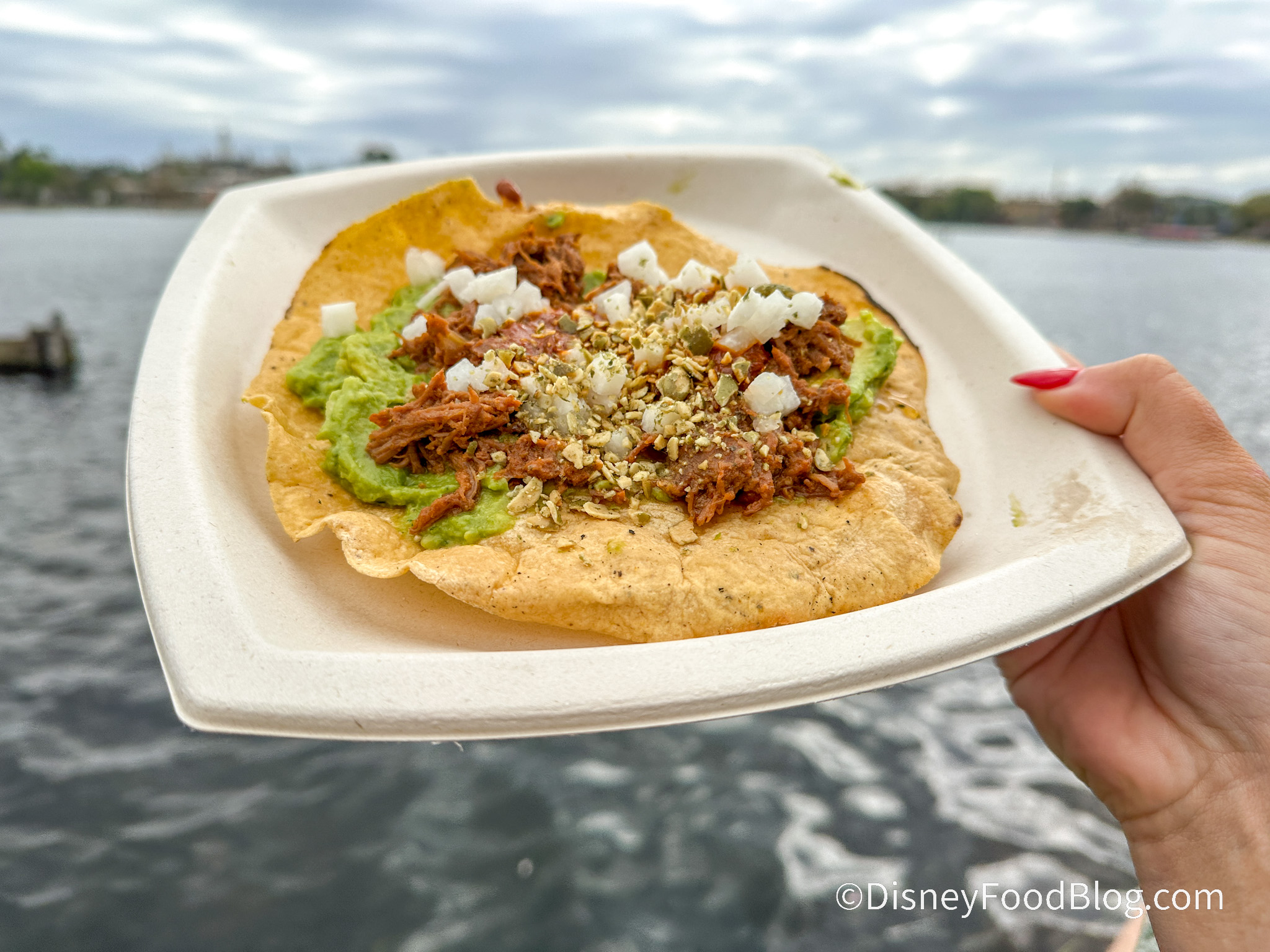- “Giant” Tostada de Carne: Oaxacan tostada, barbacoa beef, guacamole, jícama, pumpkin seeds, and salsa macha (New) — $11.50, DDP snack credit eligible