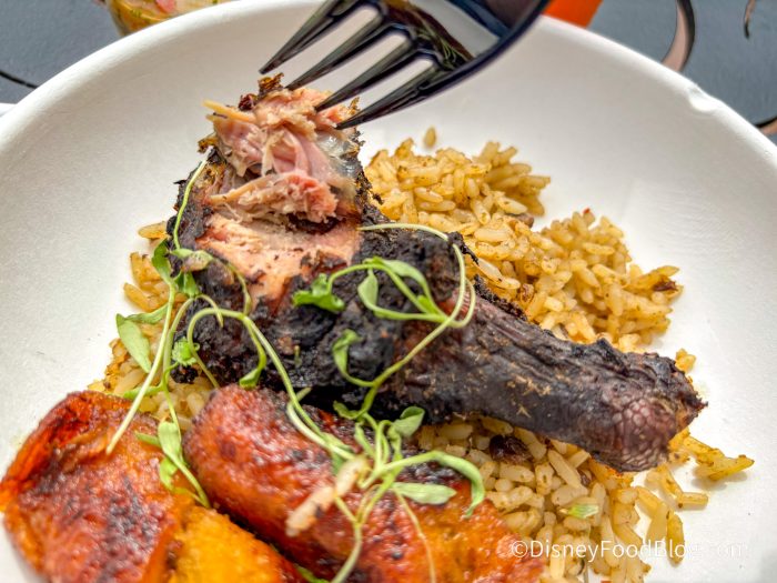 - Jamaican Jerk Chicken with Pigeon Pea Rice, Roasted Sweet Plantains, and Cinnamon Butter (New) — $6.25, Disney Dining Plan snack credit eligible