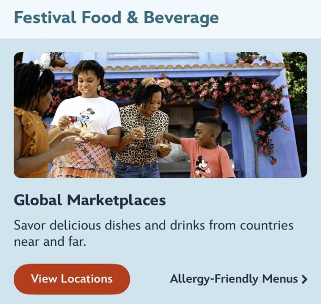 When you click the “Allergy Friendly Menus,” you can find items that are friendly for guests with gluten/wheat, egg, soy, peanut/tree nut, milk, sesame, fish/shellfish and other allergies. (Please be aware that Disney has stated the following regarding Festival Marketplace Booths: “We use reasonable efforts in our sourcing, preparation and handling procedures to avoid the introduction of the named allergen into menu choices. While we take steps to prevent cross-contact, we do not have separate allergy-friendly kitchens and are unable to guarantee that a menu item is completely free of allergens.”)