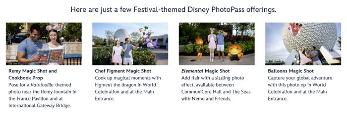 Festival guests can take advantage of several different photo opportunities — including digitally enhanced Magic Shots — all centered around food! Simply ask any Disney PhotoPass photographers at the following locations for the Festival Magic Shots they can take: