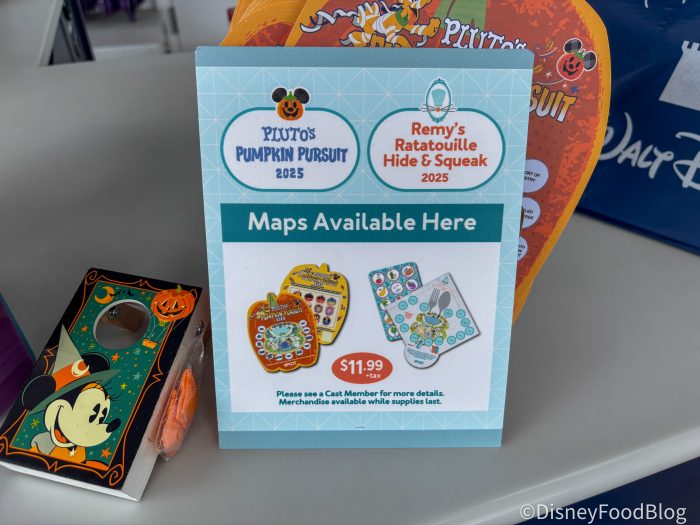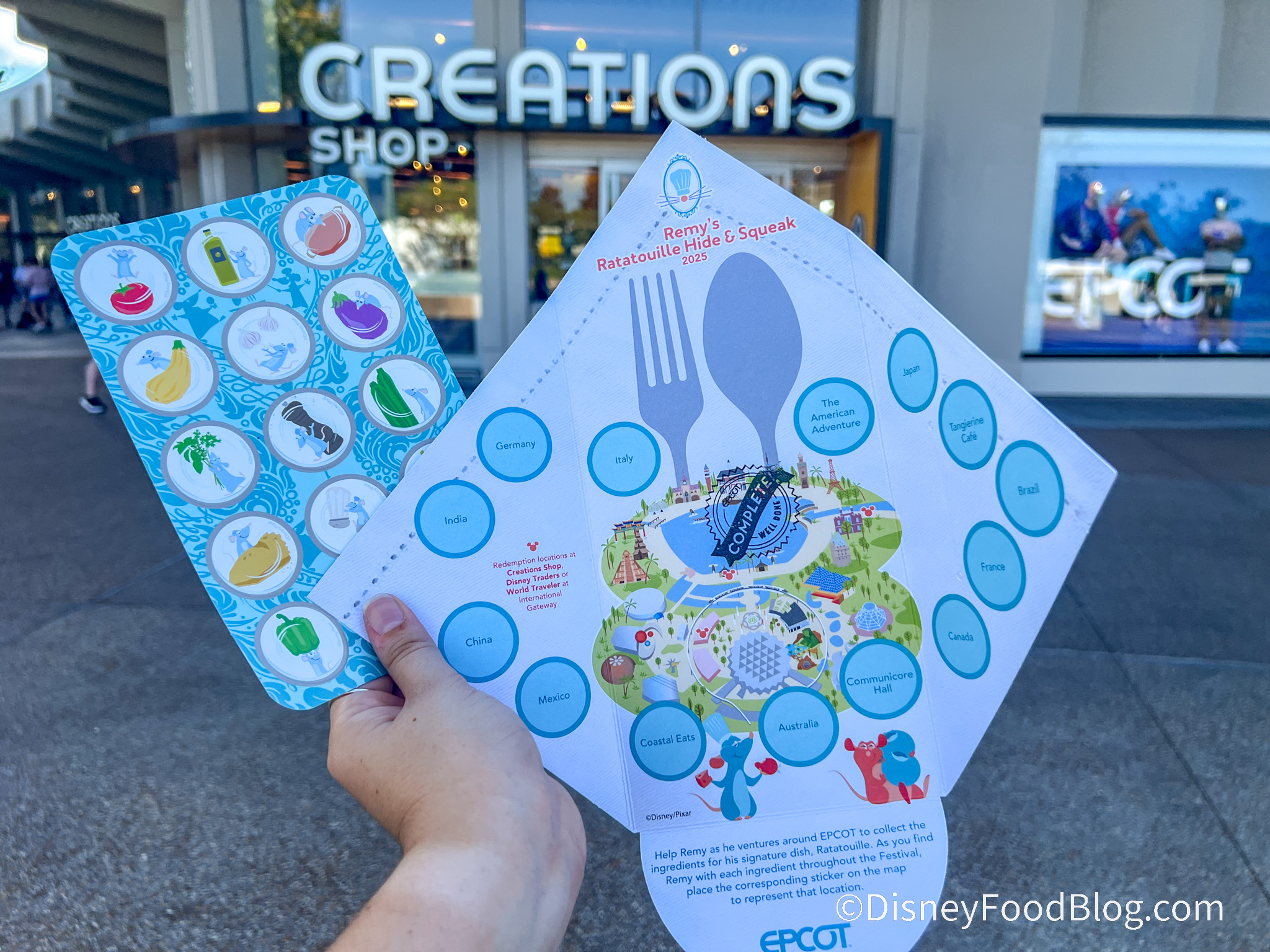 The pursuit works similar to Remy’s Scavenger Hunt, in that guests can purchase a game board and stickers at select merchandise locations including Disney Traders, Creations Shop, and festival markets.