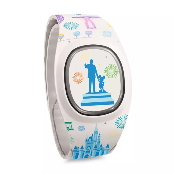 Finally, you can also pick up this Walt Disney World MagicBand. The tappable icon in the middle features the Partners statue from Magic Kingdom. You will spot Walt Disney and Mickey Mouse watching the fireworks! The band features a variety of Disney World icons, including the Tree of Life, Cinderella Castle, Spaceship Earth, and more.