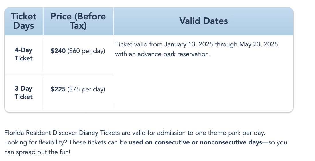 The Florida Resident Discover Disney Tickets will become available for purchase on January 7th. It’s a special 4-day ticket for $60 per day, plus tax. The total price comes out to $240 plus tax, which is a great deal that only those who reside in Florida can take advantage of. There is also a 3-day ticket also available for $225 plus tax.