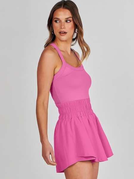 This sleeveless romper is made up of 85% Nylon, and 15% Spandex, and is available in a slew of summer colors ranging from plain grey and greens to hot pink and teal.
