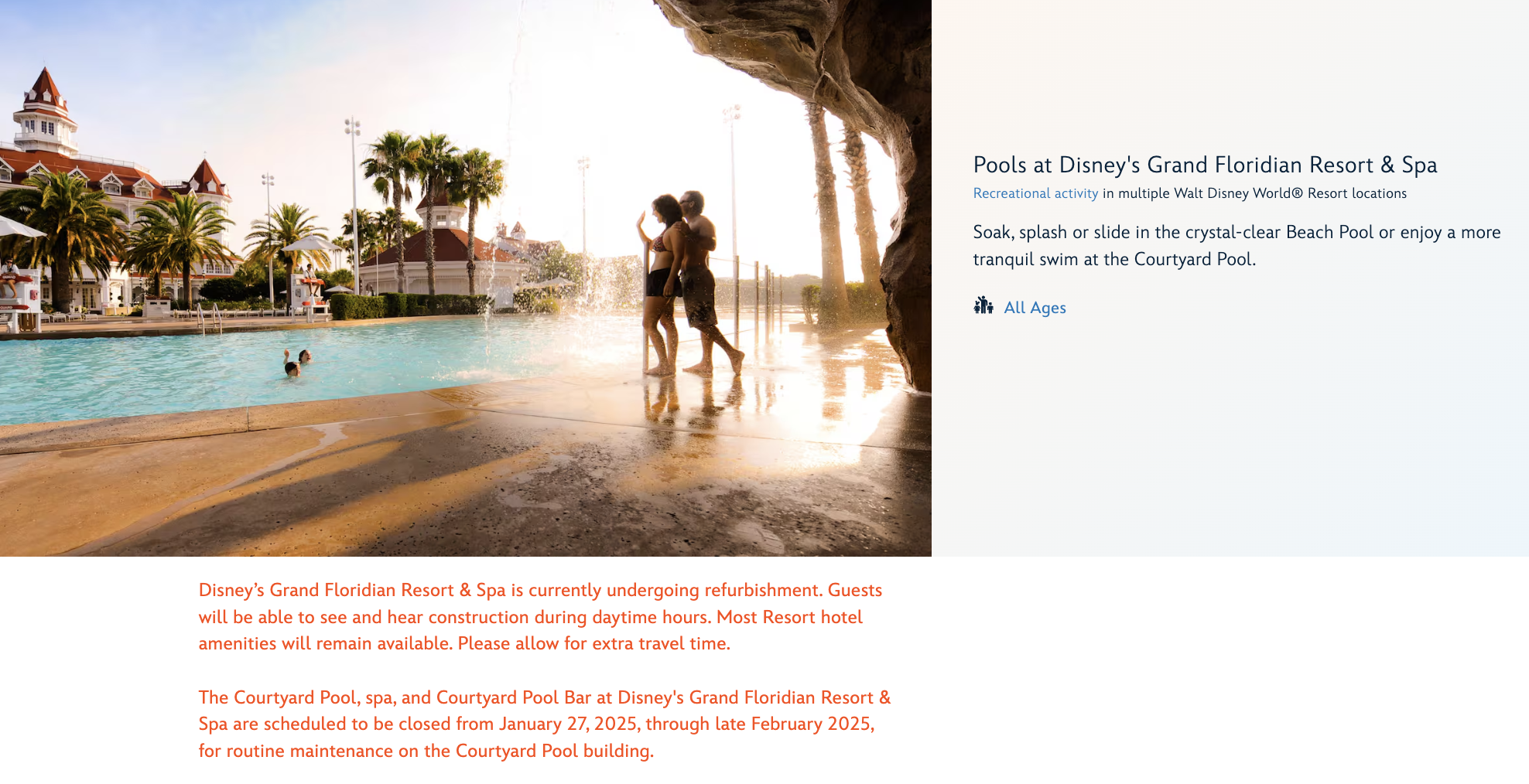 We don’t have an official end date for the Courtyard Pool closure at the Grand Floridian, but we’ll let you know as soon as we know more!