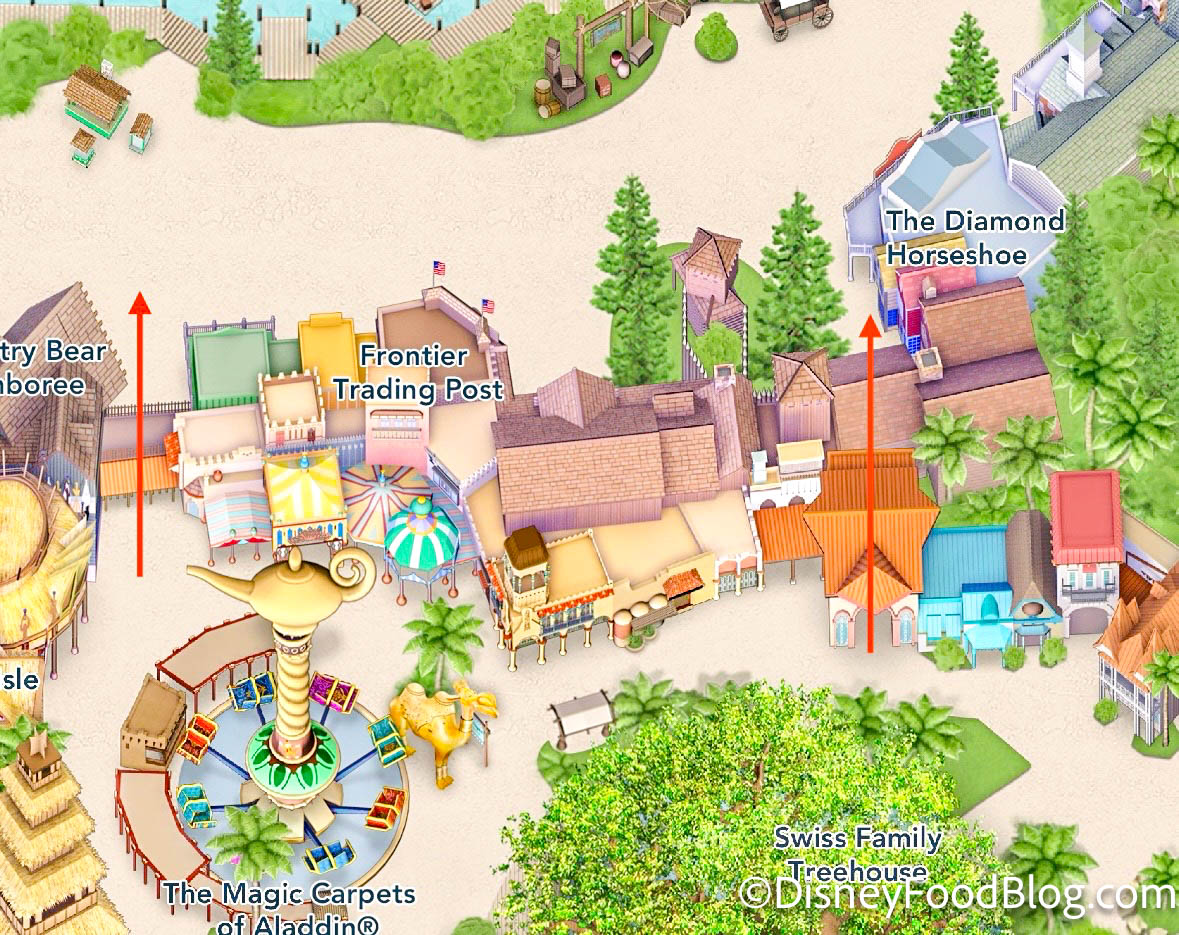 We’ve even got TWO shortcuts that can get you from Frontierland to Adventureland (and back again). One path is next to Aloha Isle and Frontier Trading Post. You’ll find the second between The Diamond Horseshoe and Skipper Canteen. The second pathway has a bathroom, too, just in case you need to go.