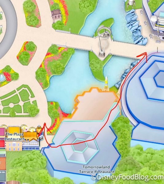 Okay, let’s say you’re trying to get to Tomorrowland quickly from Main Street, U.S.A. You do NOT have to walk all the way down Main Street to the hub in front of Cinderella Castle. Instead, take a right at Plaza Restaurant and keep walking until you walk through Tomorrowland Terrace. You’ll find a pathway that takes you through this restaurant that’s only open for Happily Ever After fireworks dessert parties and just past the purple wall, putting you right at the front of Tomorrowland.