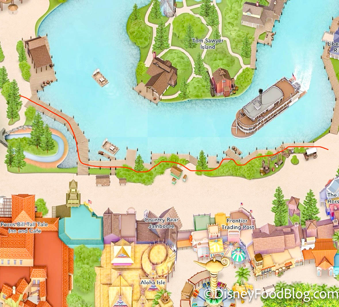 Okay, our final shortcut is one that might not be around much longer, given that the area will soon be busy with construction thanks to the new Cars expansion coming to Frontierland. However, there’s a raised sidewalk on the bank of the Rivers of America (which will be going away soon) that can take you around a large portion of Frontierland, especially if you njeed to get away parade crowds. This one is also scenic, and we’ll miss that view when it goes away.