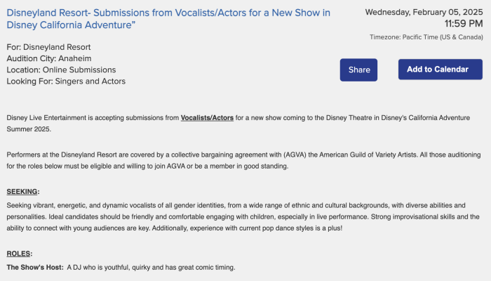 According to the Disney Careers website, Disney Live Entertainment is casting for a new role and looking for vocalists for a new show coming to the Disney Theater in California Adventure!