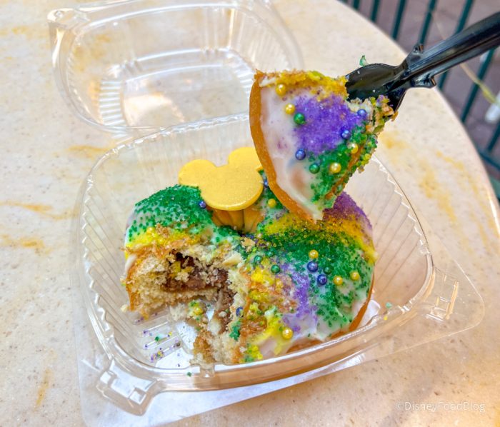 Much like holiday fruitcakes, King Cakes can vary wildly and we’ve seen King Cakes pop up around Disney parks before — so we were interested to see how this one stacked up.