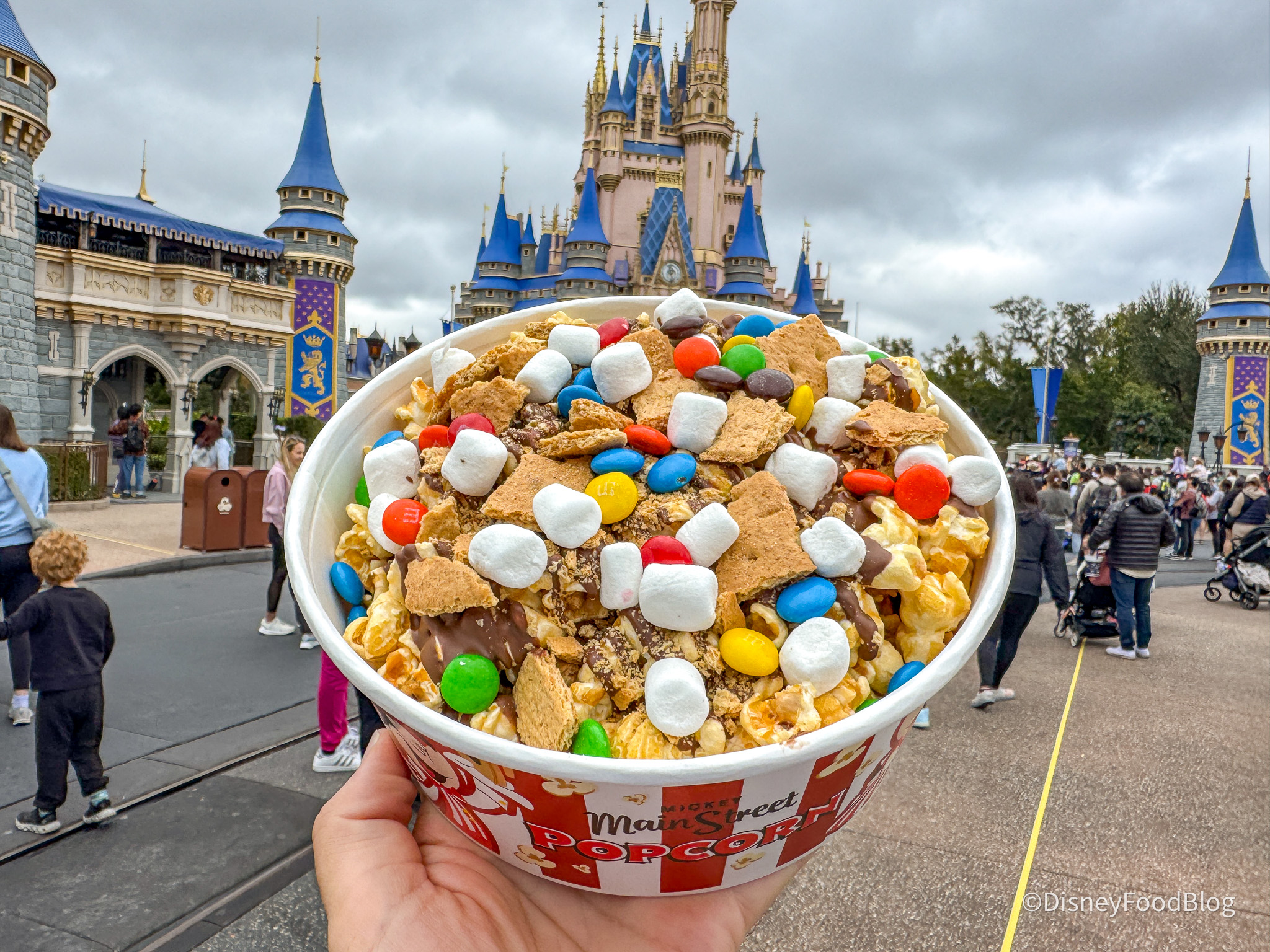 Currently, at the Main Street Confectionery, you can try either the Valentine’s mix (which is the same as it was last year) or the NEW S’mores mix! Since we have previously tried the Valentine’s mix, we decided to try out the S’mores mix. This popcorn mix is a combination of caramel popcorn, milk chocolate M&Ms, marshmallows, crushed graham crackers, and a drizzle of chocolate on top.