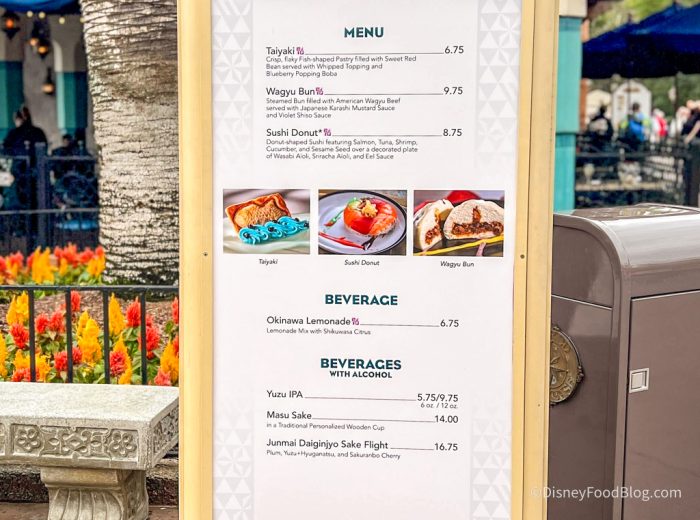 Well, this is odd. We spotted the Goshiki booth’s menu board stationed in the…Morocco Pavilion? We have a feeling that this is temporary since Disney already confirmed that the booth will be located in the Japan Pavilion. But, hey, either way, here’s your first look at the menu!